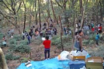 2006.11.252(土)に東山の森の一部である名古屋大学の森の中で、名古屋市千種区のまちづくり事業「千の種あかし隊」のワークショップが開かれました。今回の活動内容は、親子で竹などを使って秘密基地をつくるという企画でした。 活動内容は、 @はじめのあいさつ Aグループごとに自己紹介、何をつくるかをスケッチしながら話し合い